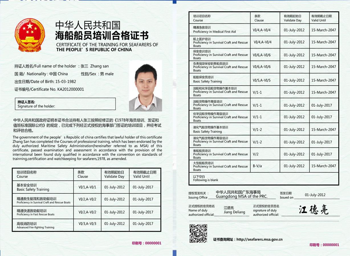 中華人民共和國(guó)海船船員培訓(xùn)合格證書(shū)